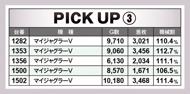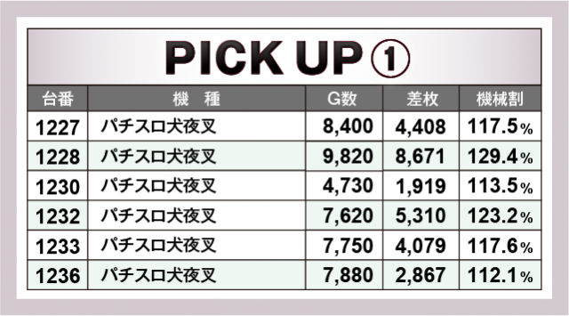 続いてはこの日のピックアップ好調5機種。特に、『パチスロ犬夜叉』の盛り上がりには目を見張るものがあり、優秀6台のトータル差枚数が+2万7千枚OVERを獲得!また、『押忍!番長ZERO』では万回転も見られ、優秀6台のトータル差枚数が+2万5千枚を突破し、ともに人気機種の圧倒的存在感を示した。ノーマル機種でも安定した活躍が印象的な内容だ。『アイムジャグラーEX』から+3千枚OVERが1台飛び出しており、『マイジャグラーV』でも3台が+3千枚OVER!さらに『チバリヨ-30』では、1582番台の+7,190枚を筆頭にとても打ちごたえのある状況だったのはおわかりだろう。