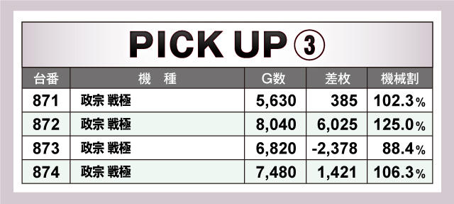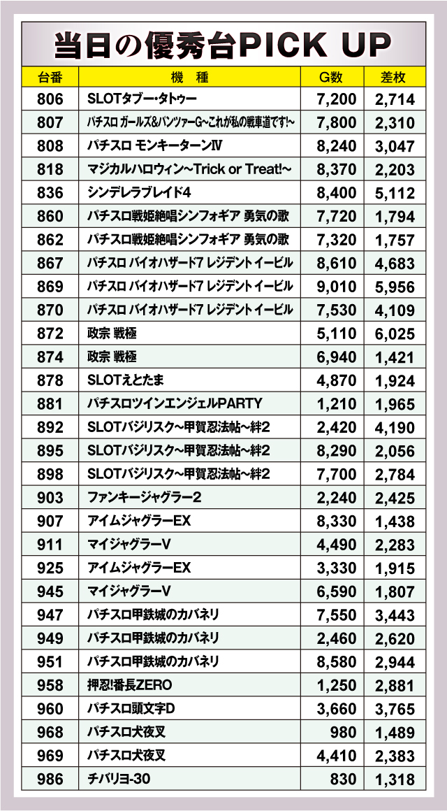 さて、まずは優秀だった30台を見ていこう。多種多様な機種がランクインしているなか、注目は5,000枚オーバーが3台、4,000枚オーバーが6台と高記録をマークする機種が多数あったことだろう。なかでも872番台の「政宗 戦極」は6,025枚と素晴らしい記録だった。