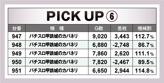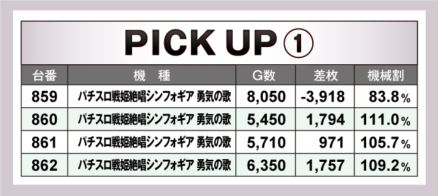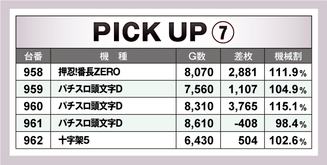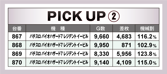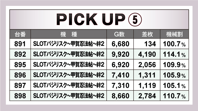 次に並びで好成績を収めていたピックアップに注目していこう。ピンクアップは上記の7箇所。どの並びも目覚ましい活躍を見せていたが、特筆すべきは「パチスロ バイオハザード7 レジデント イービル」と「SLOTバジリスク~甲賀忍法帖~絆2」の2箇所。「パチスロ バイオハザード7 レジデント イービル」は、4台全台プラスで3/4台が4,000枚オーバーと圧倒的。「SLOTバジリスク~甲賀忍法帖~絆2」も6台全台がプラスで、5/6台が4ケタのプラスで終了と、どちらも圧倒的な差枚で店内を盛り上げていた。