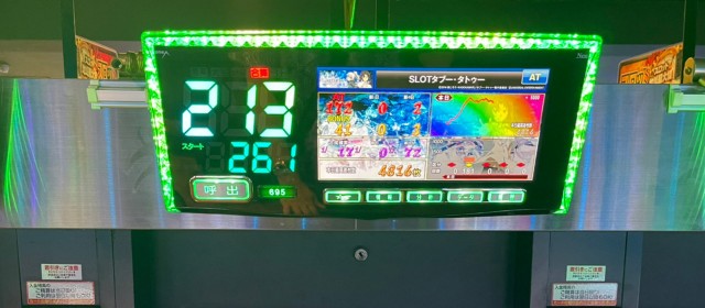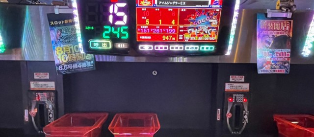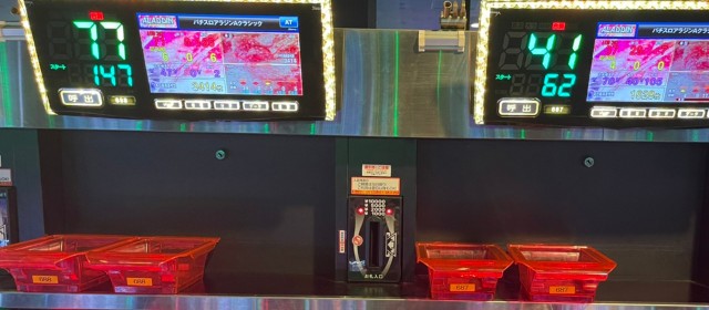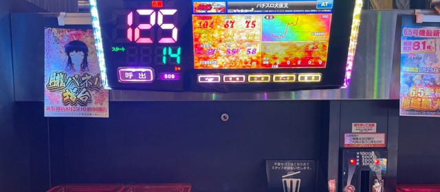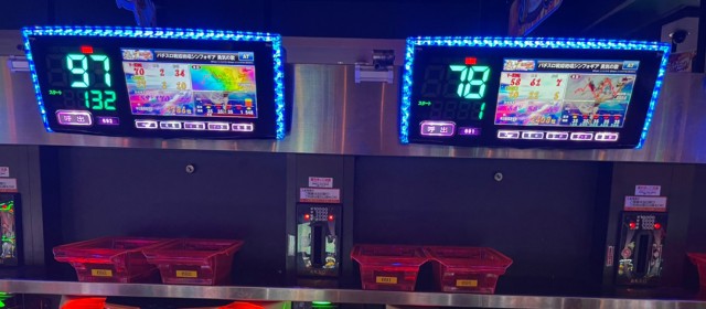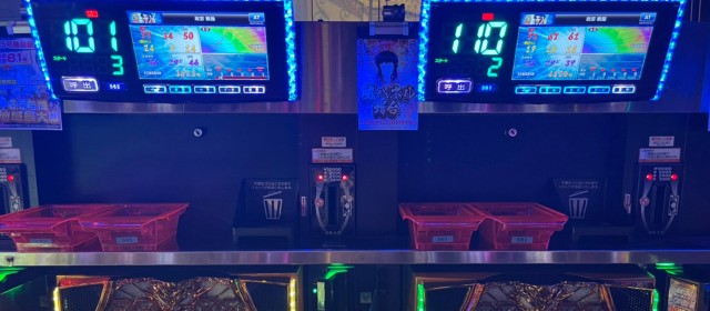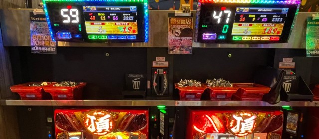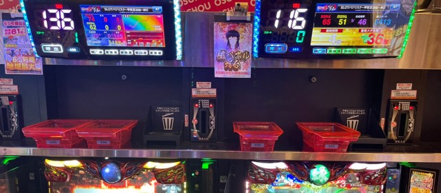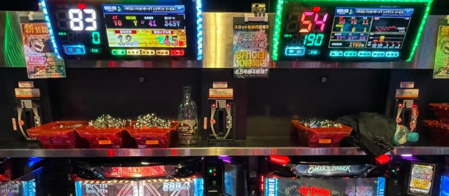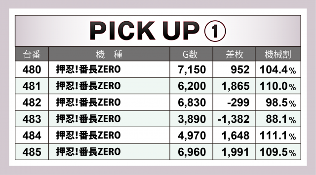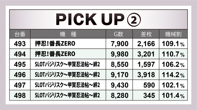 続いては8箇所6台ずつ計48台の横並び好況スポットについて。マイナス台がいくつか見られたが全体的に好調な差枚数を刻み、ドル箱の量やボーナス回数で特に際立ったのは『押忍!番長ZERO』『SLOTバジリスク~甲賀忍法帖~絆2』のベテラン機種だった。