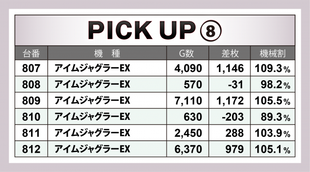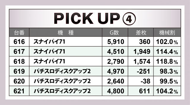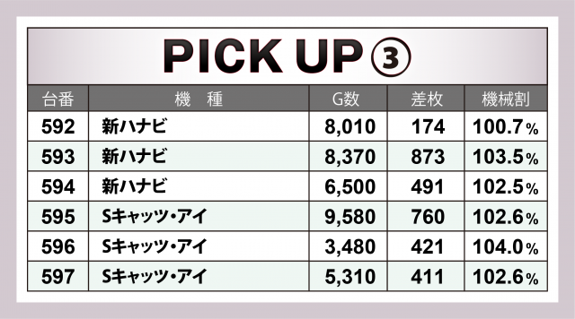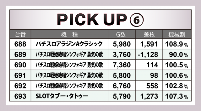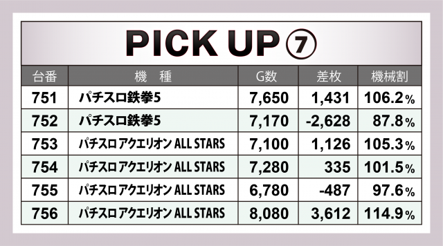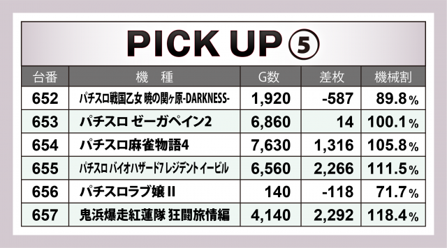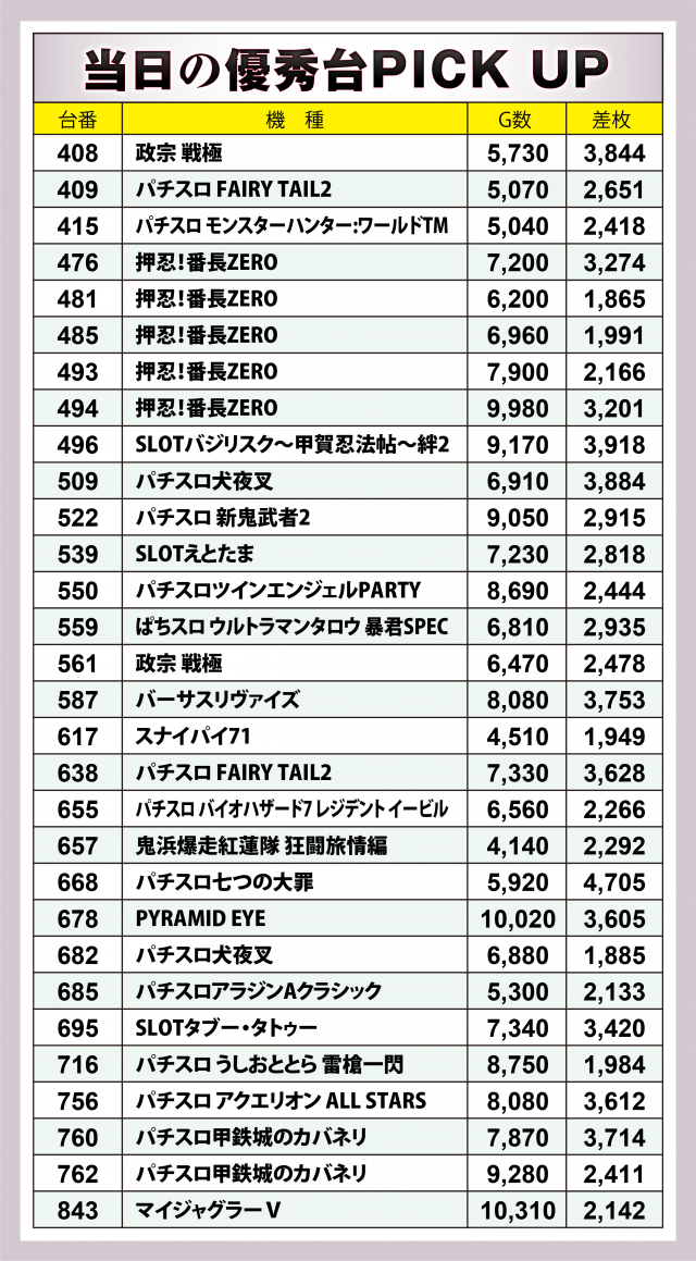 まずは優秀30台のPICK UPから。この日は30台のうち25台が差枚数+2千枚以上、+3千枚以上が12台となった。後述する横並び好況スポット以外では6.5号機の好成績が光った。共に2台トータルで+6千枚を超えた『政宗 戦極』『パチスロ FAIRY TAIL2』『パチスロ甲鉄城のカバネリ』の3機種が好調を収め、その他では+5千枚近くとなった『パチスロ七つの大罪』が目に付いた。