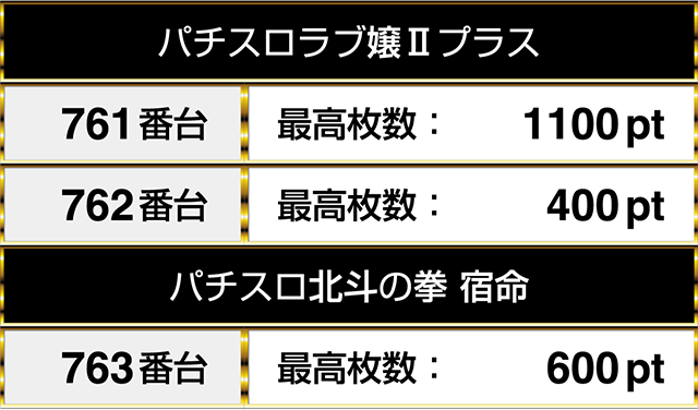 『パチスロラブ嬢Ⅱプラス』の2台は『パチスロ北斗の拳 宿命』の1台と並んでプラスptとなった。