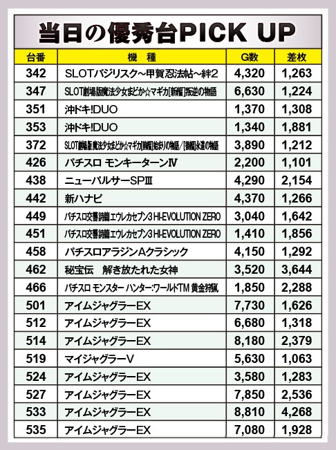 まずは当日の優秀台PICK UPから。この日は21台が差枚数+1千枚以上、+2千枚以上が6台と少々寂しい結果となってしまったが、後述する好調スポット以外では、462番台の『秘宝伝 解き放たれた女神』で+3,644枚、次いで466番台の『パチスロ モンスター ハンター:ワールドTM 黄金狩猟』で+2,288枚、さらに438番台の『ニューパルサーSPⅢ』で+2,154枚が目立っていた。