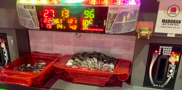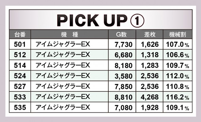続いては、1機種7台の好況機種が出現。当日のトップ差枚である533番台の+4,268枚を叩き出した人気機種『アイムジャグラーEX』である。533番台を筆頭に7台の合計差枚数は+1万5千枚over!店内がGOGOランプとファンの笑顔で輝いていたことは言うまでもないであろう!
