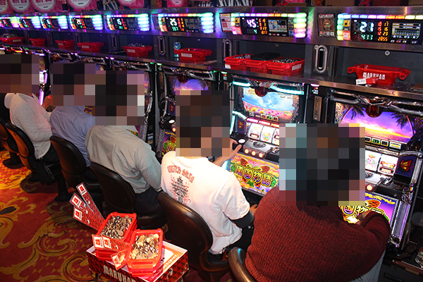 5円パチスロと1円パチンコのコーナーにも幸せそうな笑顔が広がっており、雰囲気も明るい。