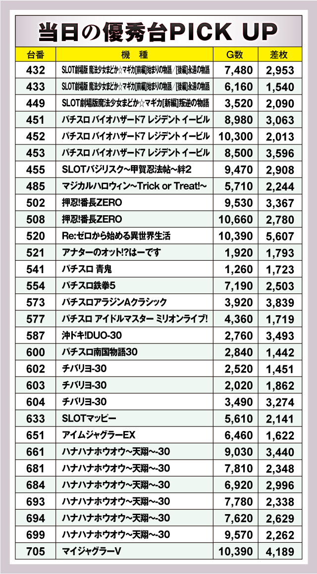 優秀台TOP30台を見て、まず注目なのは「ハナハナホウオウ~天翔~-30」の活躍。これは後述するのでここでは省くが、その他は「SLOTバジリスク~甲賀忍法帖~絆2」や「SLOT劇場版 魔法少女まどか☆マギカ[前編]始まりの物語/[後編]永遠の物語」など、人気機種から少数設置台まで幅広い機種がランクインしている。そんな中でもっとも差枚数の高かったのは、520番台の「Re:ゼロから始める異世界生活」の+5,607枚! その他も3,000枚クラスの台が約半数と、しっかりと結果は残していたと言えるだろう!