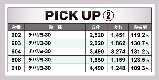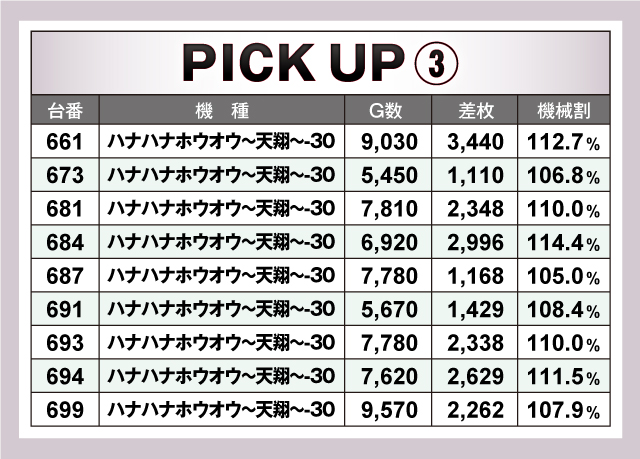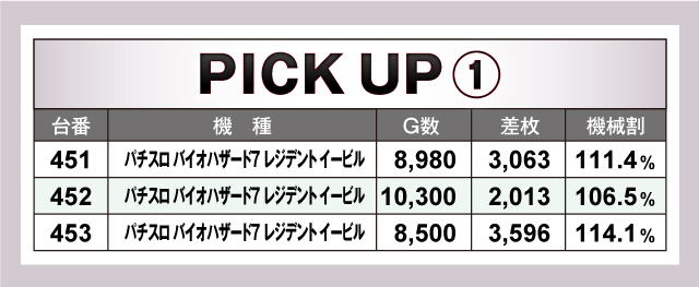 次にピックアップを見ていこう。今回ピックアップしたのは、「パチスロ バイオハザード7 レジデント イービル」「チバリヨ-30」「ハナハナホウオウ~天翔~-30」の3機種。中でも「パチスロ バイオハザード7 レジデント イービル」は3台並びで全台プラスの平均9,260G、+2,891枚と、G数/差枚数ともに高い数値を残している。そして何と言っても「ハナハナホウオウ~天翔~-30」は、9台ピックアップどれもが4ケタオーバーで、平均差枚数は+2,191枚。アッパレの一言!