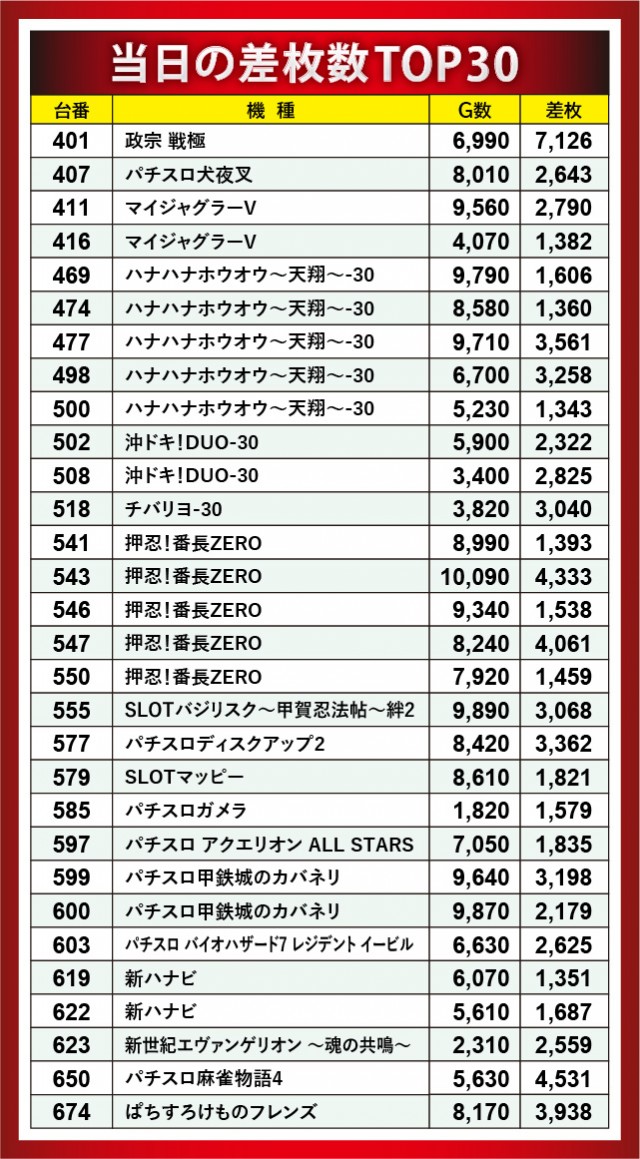 6.5号機『政宗 戦極』にて7,126枚という凄まじい記録が生まれた一方で、『押忍!番長ZERO』では万回転OVERが発生。さらに4千枚OVERが2台見られるなど、まだまだ人気機種として君臨する実力を見せつけていた。他にも最多設置機種『ハナハナホウオウ~天翔~-30』では朝から閉店までじっくりと遊技され、多種多様な機種でドル箱に手が伸びる光景が印象に残る内容だ。