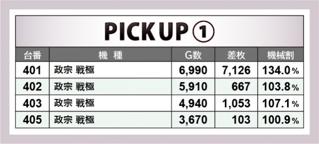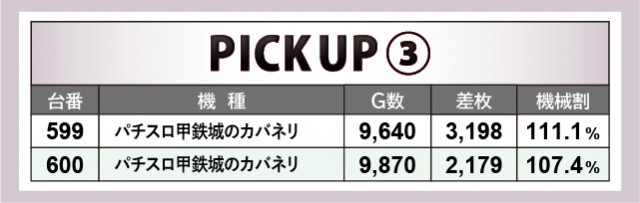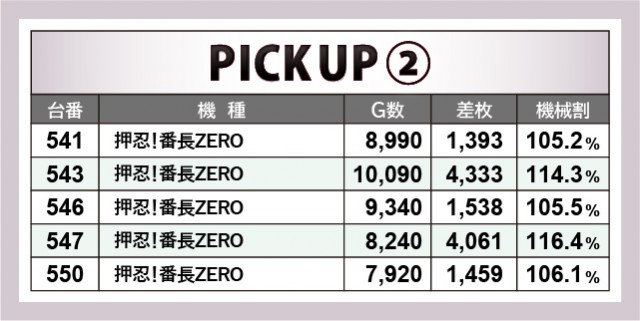 AT機は前述したように、『政宗 戦極』『押忍!番長ZERO』の2機種に加えて、『パチスロ甲鉄城のカバネリ』が大きな活躍を披露していた。いずれも多くのゲーム数が消化されており、特に『パチスロ甲鉄城のカバネリ』は2台中全台プラスを達成。2~3千枚OVERという記録も申し分なく、これからのパチスロコーナーを牽引してくれそうな結果を残してくれたと言える。