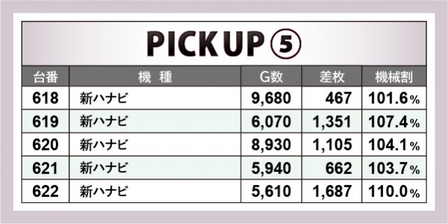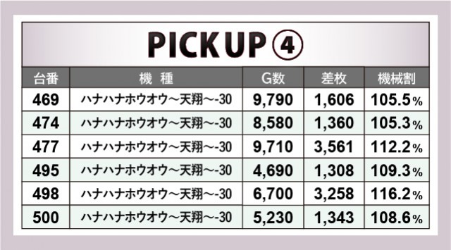『ハナハナホウオウ~天翔~-30』『新ハナビ』は遊技性が少々異なるものの、コンスタントなボーナス当選が見られた。後者は設置されている5台全台がプラスを記録しており、安定した結果にファンも納得したかもしれない。定番の沖スロ『ハナハナホウオウ~天翔~-30』でも3千枚OVERが放たれ、十分な結果を得て満面の笑みを浮かべるファンが少なくなかった。