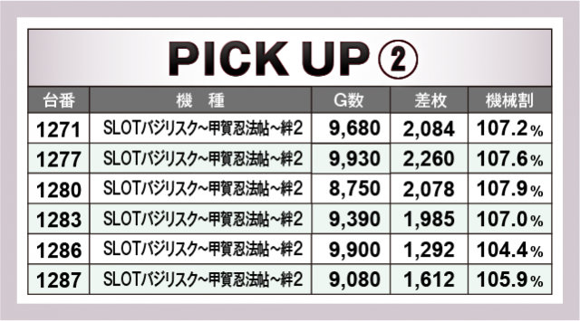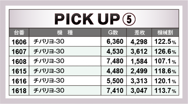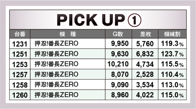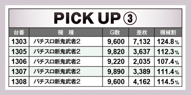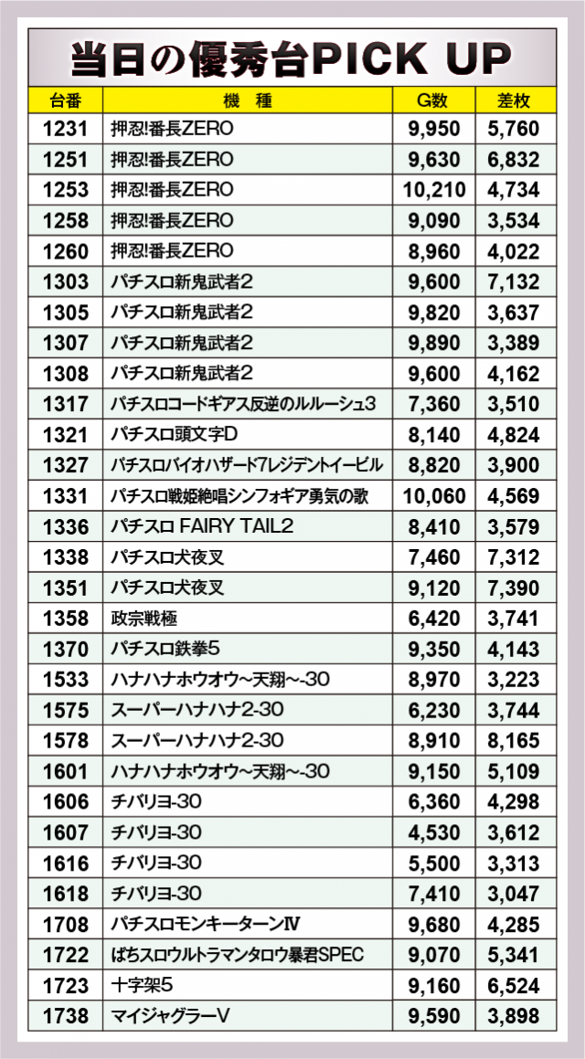またこの日は、5箇所計29台の好況スポットが出現。中でも特にハイスコアを残したのが、『押忍!番長ZERO』で4台横並びを含む計6台でトータル差枚数+2万7千枚オーバーという好成績に!次いで、『パチスロ新鬼武者2』のピックアップ5台が横並びでトータル差枚数+2万枚を突破した!ほかに、『SLOTバジリスク~甲賀忍法帖~絆2』でも好調ぶりが見られた。それらに負けじとノーマル機では、『ハナハナホウオウ~天翔~-30』と『チバリヨ-30』がそれぞれでトータル差枚数+1万8千枚オーバーを獲得した!