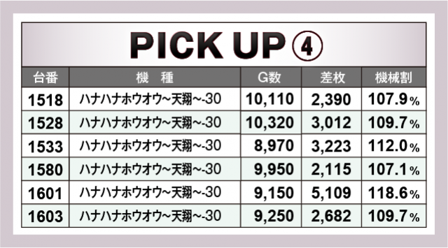 まずは優秀30台のPICK UPから。この日は、30台全てが差枚数+3千枚以上を獲得し、+5千枚オーバーが9台となった。後述する好調5機種以外では、1578番台の『スーパーハナハナ2-30』が+8,165枚、次いで1338番台・1351番台の『パチスロ犬夜叉』が共に+7千枚オーバー、さらに1723番台『十字架5』が+6,524枚、そして1722番台の『ぱちスロウルトラマンタロウ暴君SPEC』が+5,341枚と目立っていた。