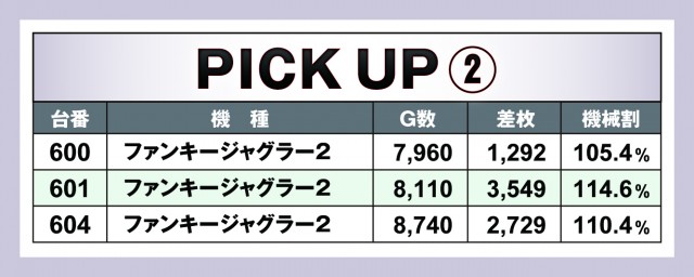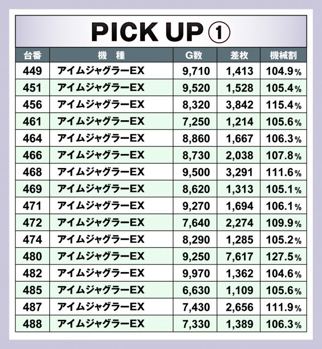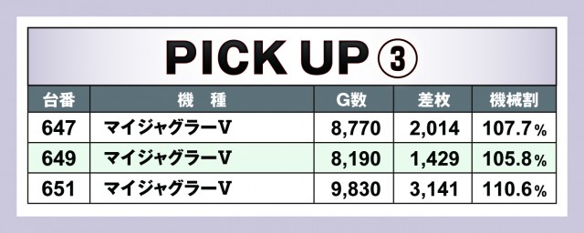 今回のピックアップは3箇所。すべてジャグラーということで、今回の優秀台が列挙されている。どの台がどれくらいの差枚数となったか。機械割はどれくらいになったか。参考にしてもらえれば幸いだ。