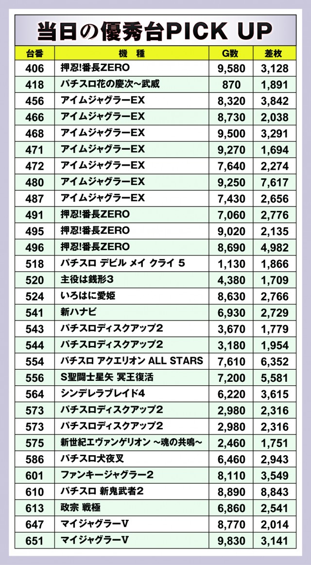 今回は『UFO豊岡』がグランドリニューアルオープンということもあり、全体的に優秀台が散りばめられていた印象。中でも目立ったのはジャグラーシリーズだろう。その他、やはり新基準となっている6.5号機の差玉が際立っている。『パチスロ 新鬼武者2』の610番台からこの日のTOP差玉となる9000枚弱! 『パチスロ アクエリオン ALL STARS』の554番台から6000枚オーバーとなるなど、見所は十二分にあった取材内容となった。