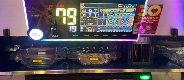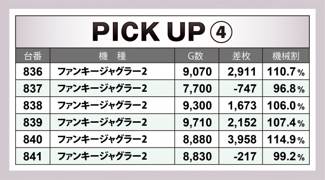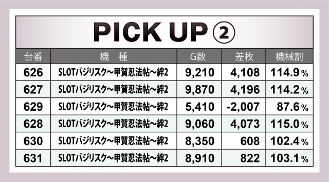またこの日は5箇所30台の横並び好況スポットが出現。最も対象台数が多かったのは『SLOTバジリスク~甲賀忍法帖~絆2』12台。マイナス台も見られたが、+6千枚クラスが2台、+4千枚オーバーが3台とハイレベル! さらにバラエティーコーナーや30パイマシン、『ファンキージャグラー2』も対象となり、それぞれで好記録を生み出していた。