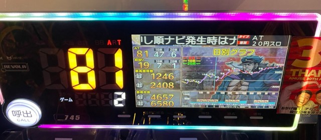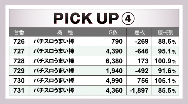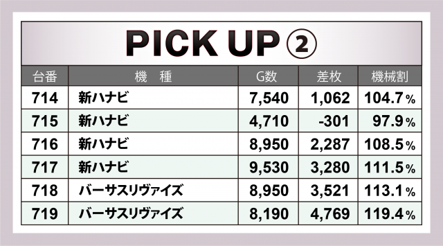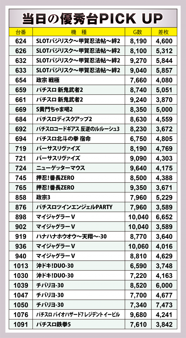 まずは当日の優秀30台PICK UPから。前回には劣るものの30台全てが差枚数+3千枚以上、22台が+4千枚以上、9台が+5千枚オーバーを達成した。後述する横並び好況スポット以外では『SLOTバジリスク~甲賀忍法帖~絆2』は4台合計で+2万1千枚超、『マイジャグラーⅤ』は4台合計で+1万9千枚弱、『チバリヨ-30』は3台合計で+1万8千枚を突破といずれもハイスコアに。また『パチスロ 新鬼武者2』『S黄門ちゃま喝2』『パチスロ鉄拳5』といった6.5号機も好成績を残した。