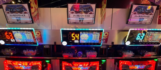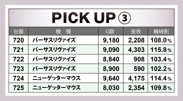 続いては4機種4箇所の計24台横並び好況スポットについて。この日は全てボーナスタイプが対象。中には『バーサスリヴァイズ』『ニューゲッターマウス』の様に+4千枚超えと、らしからぬ高い出玉数を叩き出した台が続出した。