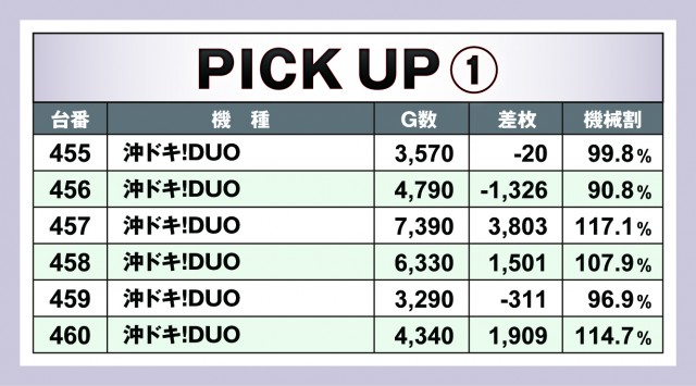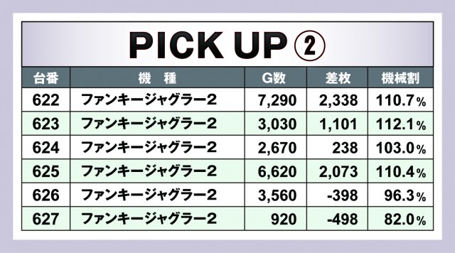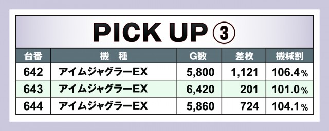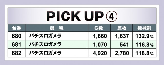 ピックアップは4箇所。このデータを見てピンとくるのはPICK UP④の『パチスロガメラ』だろう。差枚数は全台プラス。機械割も申し分ない数値になっているが、680番台、681番台ともに1000Gそこらの稼働になっており十分ではない。おそらくではあるが、全台系の可能性があったのではないかと推察される。少台数機種でもチャンスがあるということか!?