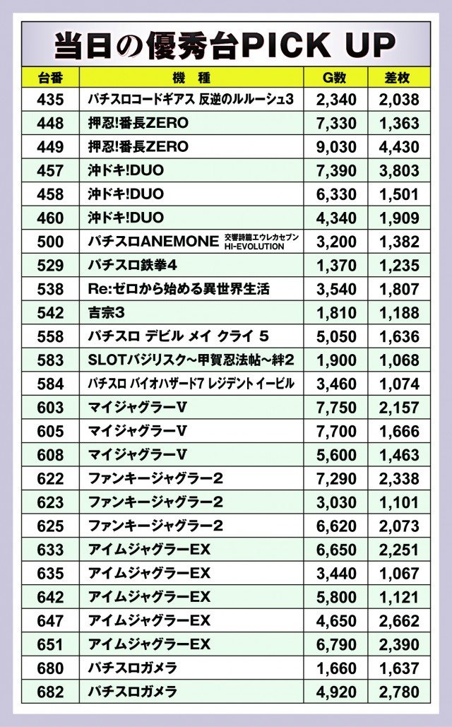 初実施となった「英雄の軌跡~ヒーローズレポート~」の優秀台は上表の通り。元々、関西ではジャグラー文化が行き渡っている地域だが、やはり『マイジャグラーⅤ』『ファンキージャグラー2』『アイムジャグラーEX』などの6号機ジャグラーが名を連ねている。その他、人気機種の『押忍!番長ZERO』の449番台から4,430枚、『沖ドキ!DUO』の457番台から3,803枚と随所に高設定と思わしき優秀台が飛び出た取材内容となった。