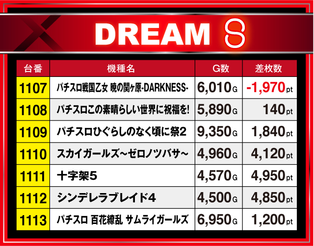 ナ:『パチスロ戦国乙女 暁の関ヶ原-DARKNESS-』は残念ながらマイナスとなっていますが『パチスロこの素晴らしい世界に祝福を!』・『パチスロひぐらしのなく頃に祭2』・『スカイガールズ~ゼロノツバサ~』・『十字架5』・『シンデレラブレイド4』・『パチスロ 百花繚乱 サムライガールズ』といったバラエティ機種たちが軒並み4500回転以上回されていて、しっかり結果もついていました!