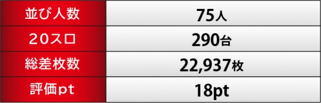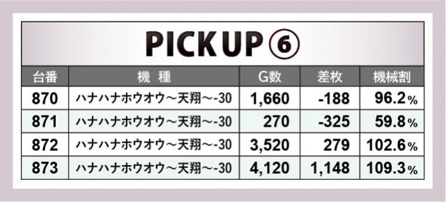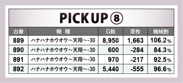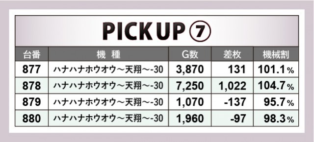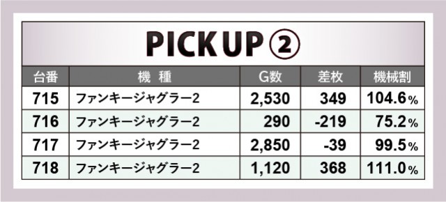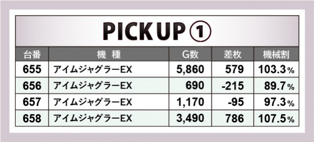『アイムジャグラーEX』『ファンキージャグラー2』には、1か所ずつ4台横並びの塊が存在していた。しかし後者の存在はファンに気づかれておらず、とても勿体ない結果となってしまったのが否めない。対して『アイムジャグラーEX』655番台が粘り強く遊技されており、ファンは手ごたえを感じていたのではないだろうか。