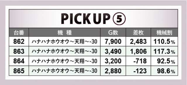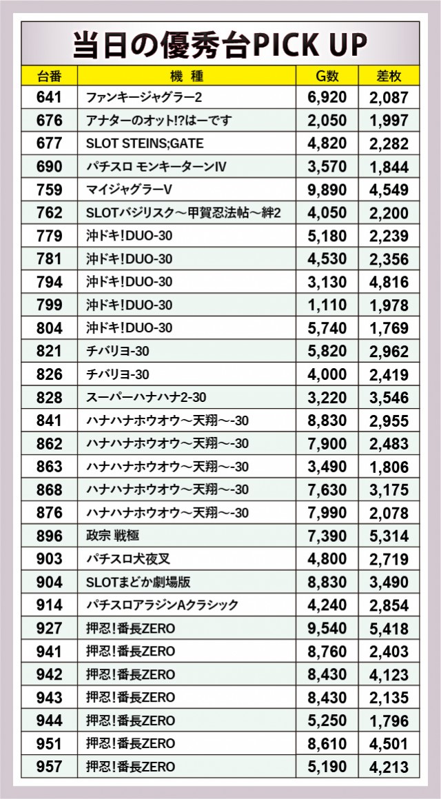 まずは優秀台から振り返っていく。最新の6.5号機まで幅広い機種が名を連ねており、飛びぬけて支持されているのが沖スロだったと窺える内容だ。『沖ドキ!DUO-30』794番台+4,816枚が記録され、『ハナハナホウオウ~天翔~-30』も各台がじっくりと遊技されていた。また『押忍!番長ZERO』の人気ぶりも相変わらずで、927番台+5,418枚を筆頭に2台の4千枚OVERが発生していたのが目に焼きつく。