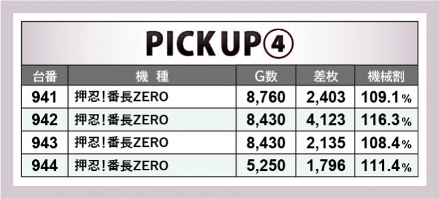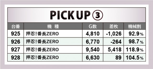 今なお根強い人気を誇る『押忍!番長ZERO』にもまた、2ヵ所の横並びスポットが見られた。927番台+5,418枚という鮮烈な記録が盛り上がりをリードし、さらに941~944番台の横並びは全台プラスを達成。また942番台+4,123枚という記録が発生したことにより、島は凄まじい熱気に包まれていた。