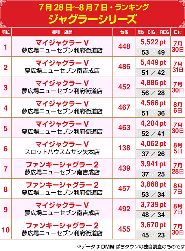 『ファンキージャグラー2』も+3,000ptオーバーを果たした3台がランクイン。