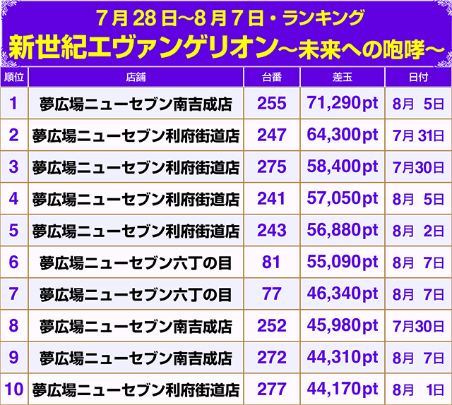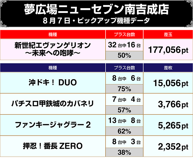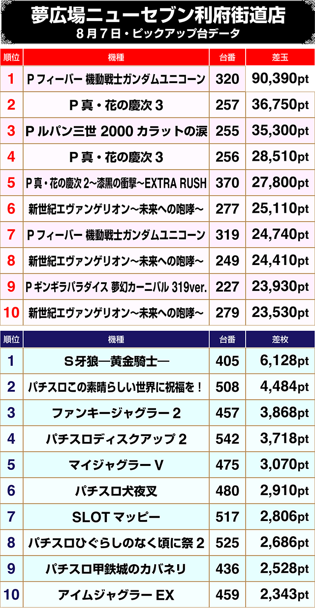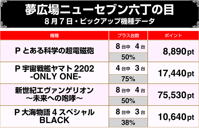 3店舗のすべてに+50,000ptオーバーのデータがあるなかで、夢広場ニューセブン南吉成店の1台が+70,000pt超を記録した。