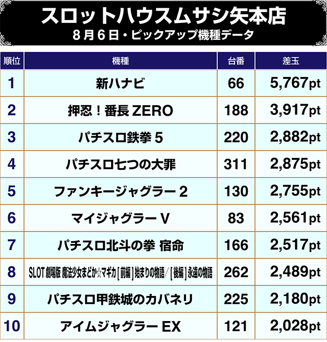 パチンコでは、2台がランクインした『P真・花の慶次3』の257番台が+36,750ptを記録。