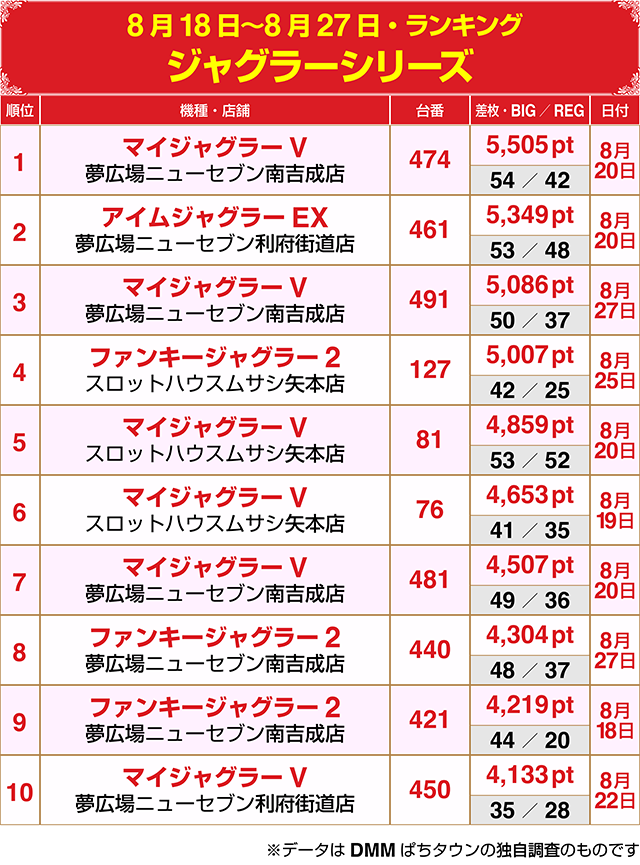 6台の『マイジャグラーV』がTOP10にランクイン!!