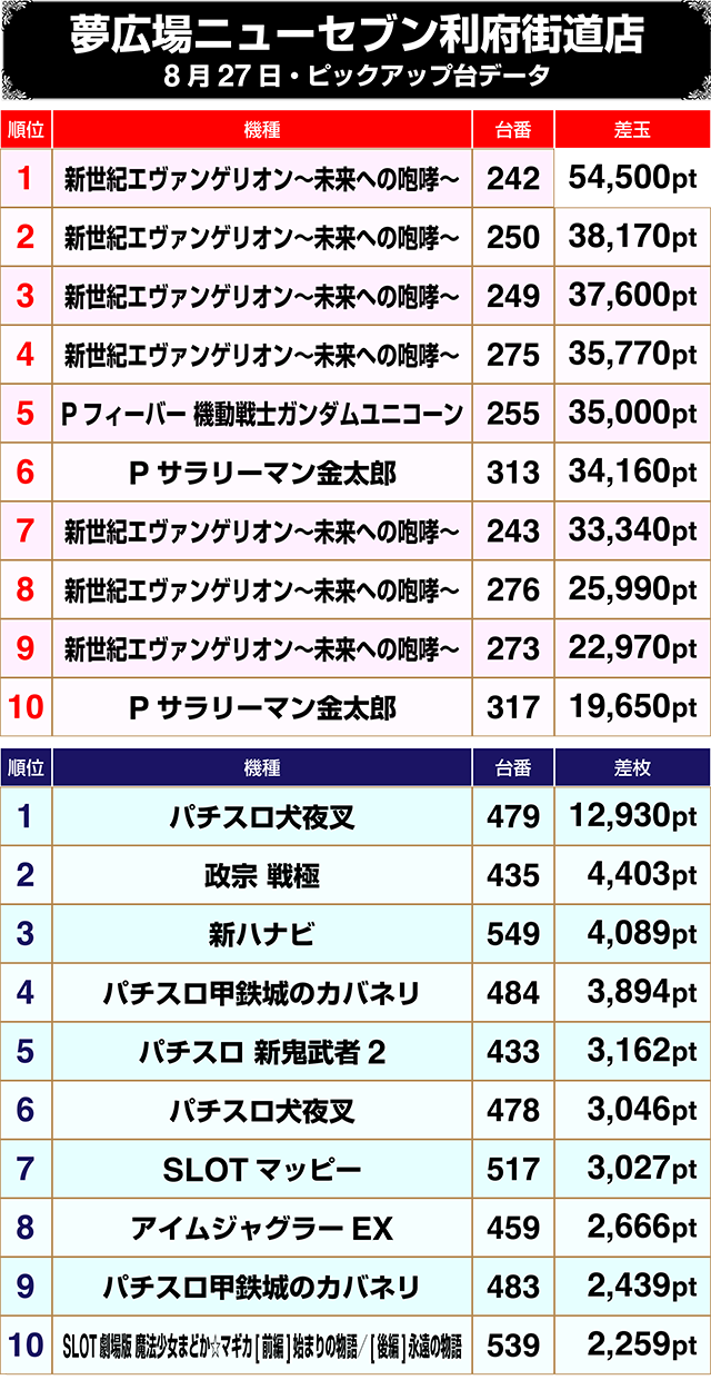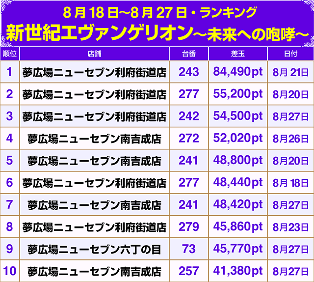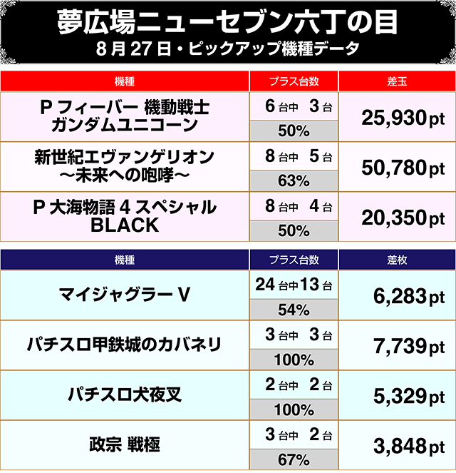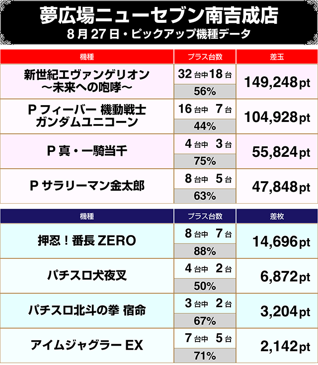 上位3台は夢広場ニューセブン南吉成店であったものの、夢広場ニューセブン利府街道店や夢広場ニューセブン六丁の目にも+40,000ptオーバーの好記録が残った。