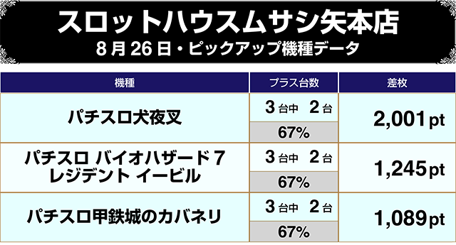 『パチスロ犬夜叉』は2台がプラスで、トータル差枚数は+2,000ptを超えた。