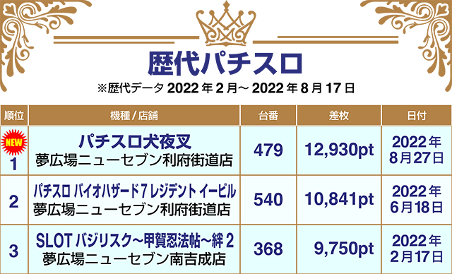 パチスロでは、479番台の『パチスロ犬夜叉』が+12,000pt超! 歴代のパチスロでもトップに輝く結果を残した。