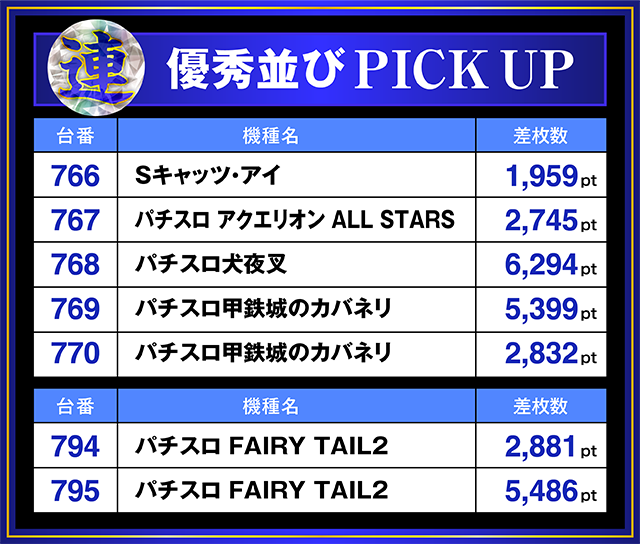 新台の「パチスロ FAIRY TAIL2」も要チェック。794番台と795番台に+2,000pt以上がならんだ。