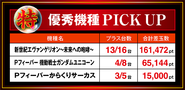 プラスとなった13台のうち7台が+10,000ptを超え、なかには+45,000ptを上回る台もあった。