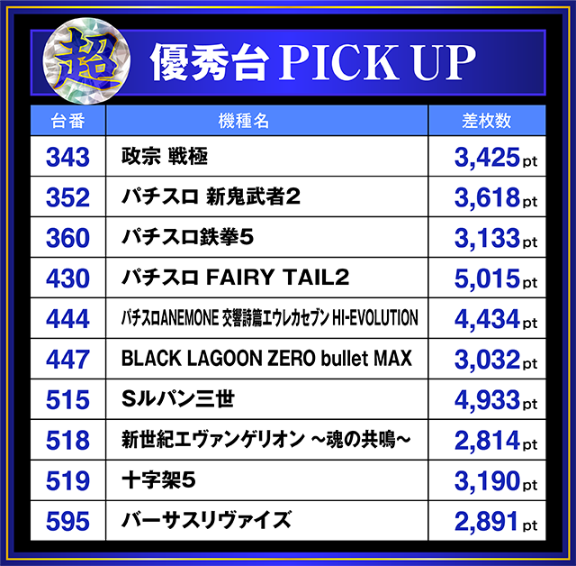 好記録を残す台がたくさんあり、8台以上が+3,000ptを上回った。