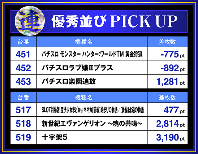 3台がならんで「連」の法則があらわれた場所はほかにもあり、「SLOT劇場版 魔法少女まどか☆マギカ[前編]始まりの物語/[後編]永遠の物語」の517番台から「十字架5」の519番台までは全台がプラス。長時間にわたって楽しまれており、結果も残したといったデータになった。