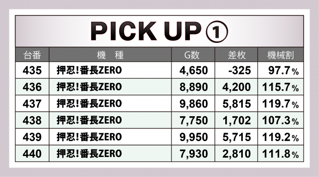 続いては4か所4機種6台ずつの横並び好況スポットについて。特に平均枚数が+3千3百枚超&6台合計+2万枚弱と高かったのが『押忍!番長ZERO』。次いで『SLOTバジリスク~甲賀忍法帖~絆2』は6台全てプラス&合計+1万4千枚弱、6.5号機の『政宗 戦極』は+5千枚台を筆頭に6台トータルで+9千枚超を達成!