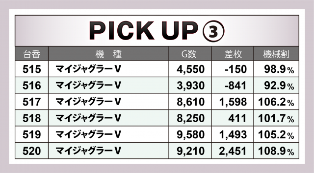当日の[1000円/46枚] スロ全400台のトータル差枚数は今回を含め直近4回の取材の中で最高となる+47,582枚を叩き出した。また、さらに評価ptは20とこちらも同じく全4回ではMAXとなり、高水準でのフィニッシュとなった。これでトータルプラス5連勝、当日は写真で挙げた以外でもドル箱後ろ積みが数多く見受けられ、盛況だった。今後の取材でも引き続き好成績に期待できそうだ。