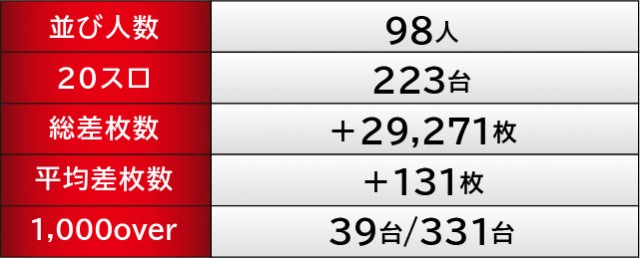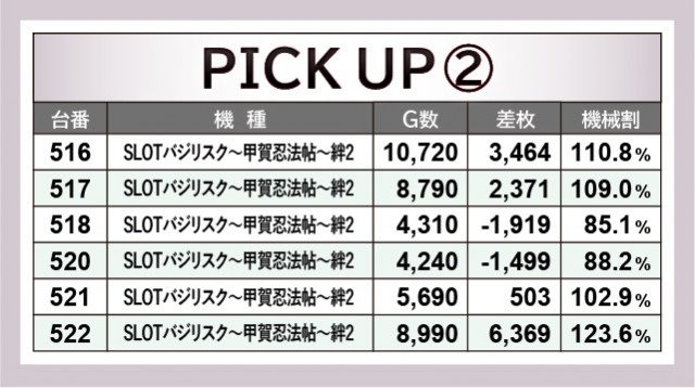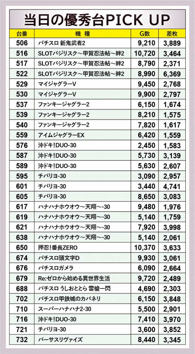 機種単位でまとまりのある出玉感があった当日、大きく活躍したのは『SLOTバジリスク~甲賀忍法帖~絆2』だった。522番台+6,369枚が発生し、遊技していたファンは手ごたえを得て充実感を得たことだろう。また『チバリヨ-30』605番台+4,741枚や『ハナハナホウオウ~天翔~-30』621番台+3,998枚など沖スロ機種の活躍も目立ち、活気と熱気に包まれた1日だったと言える。