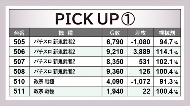 『パチスロ 新鬼武者2』から506番台+3,889枚が発生。前述した『SLOTバジリスク~甲賀忍法帖~絆2』では、522番台+6,369枚以外にも516番台+3,464枚を確認できるなど、AT機を牽引する存在だった。『パチスロ 新鬼武者2』に関しては全台が手ごたえを感じられる状況でもあったため、遊技していたファンは時間の許す限りレバーを叩いていたに違いない。