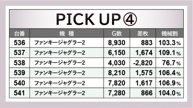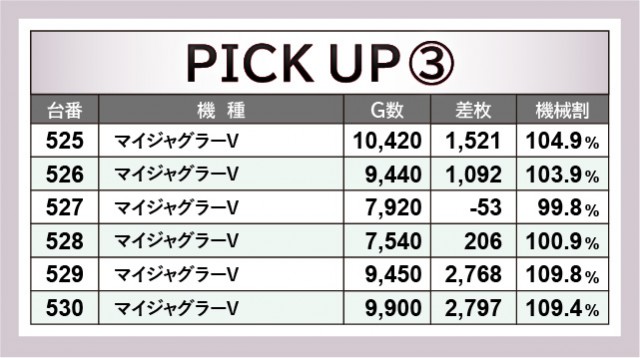 老若男女問わず愛される『ジャグラー』シリーズは、『マイジャグラーV』『ファンキージャグラー2』の2機種が目立っていた。両機種とも朝からじっくりと打ち込まれた形跡が見られ、さらには差枚数と比例した展開が印象的。残念ながらマイナスを記録する台があるものの、こちらでも手ごたえを感じられたはずだ。