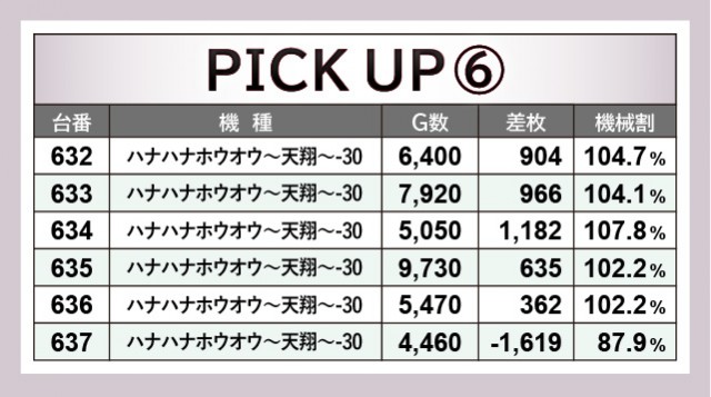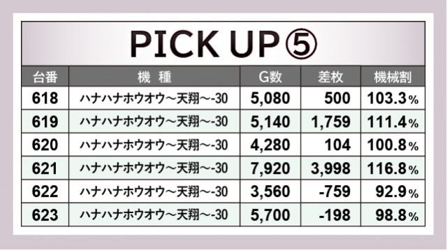 『ハナハナホウオウ~天翔~-30』は、ファンの期待に応えた台が多く見られた。621番台+3,998枚はもちろん、619番台+1,759枚など、コンスタントにハイビスカスが輝いていた光景が容易に想像できる。まとまった出玉を獲得し、遊技していたファンは恍惚の表情を浮かべていたのではないだろうか。