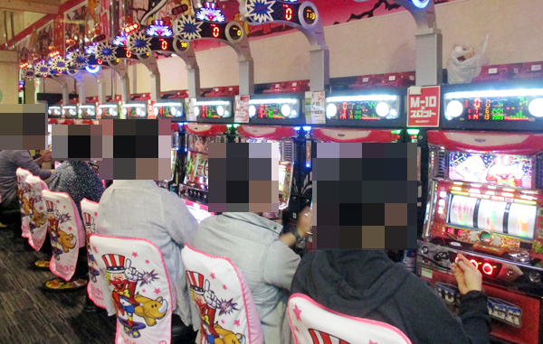 ジャグラーシリーズも大きな盛り上がりをみせており、笑顔を浮かべるプレイヤーが多数。