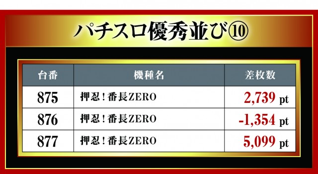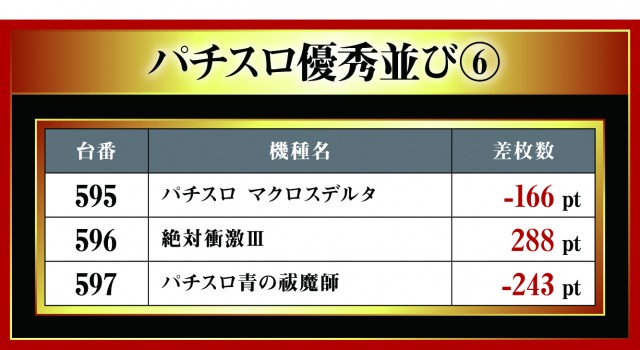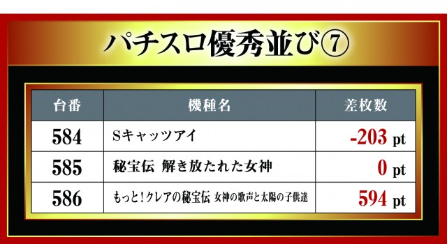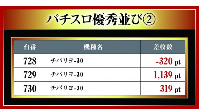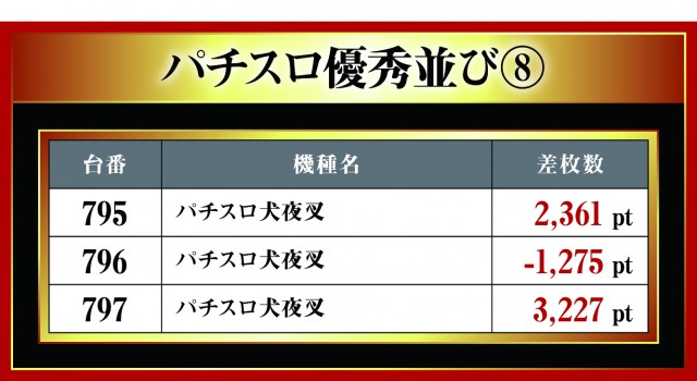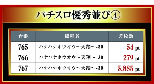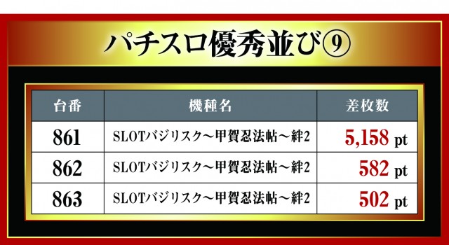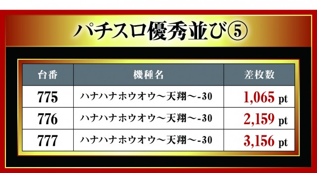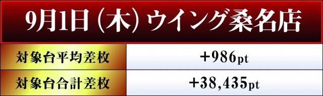 三重北ウイング4店舗を徹底取材する「はねバト!」。9月1日に実施された「桑名店」のパチスロコーナーの模様をお伝えしていこう。3台並びでの優秀台ということで、ノーマルタイプは『ハナハナホウオウ~天翔~-30』が中心! とはいえ、AT機も抜かりなく『SLOTバジリスク~甲賀忍法帖~絆2』や『押忍!番長ZERO』、そして今をときめく6.5号機の新鋭『パチスロ犬夜叉』など多数の優秀台を確認! 前回よりもかなり気合いの入った結果となった。なお、⑥や⑦などのバラエティコーナーにも3台並びが潜んでいたと思われるので、毎月1日に実施される今後の本取材にも注目してもらいたい。