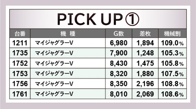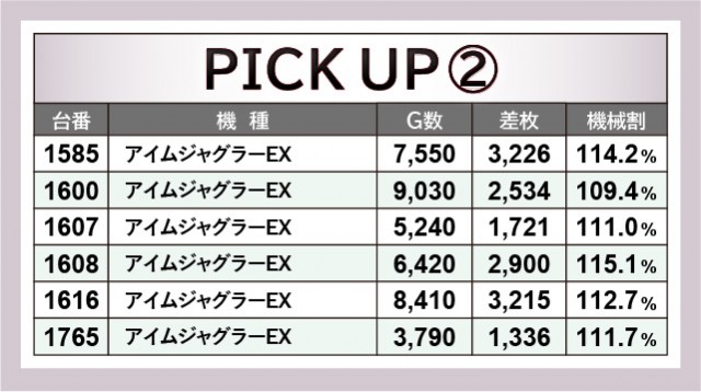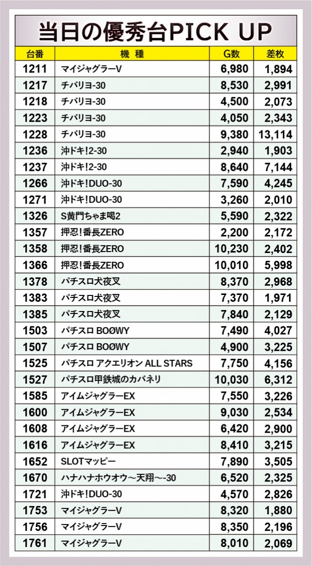 『マイジャグラーV』『アイムジャグラーEX』の2機種は、多くのファンで活気に満ちるだけでなく、熱気も放たれていたのが印象的だ。コンスタントなボーナス当選はもちろんのこと、後者では2~3千枚OVERが多発していたのが鮮烈であるばかり。消化されたゲーム数の多さも確認でき、満足度の高い遊技を味わえたのではないだろうか。