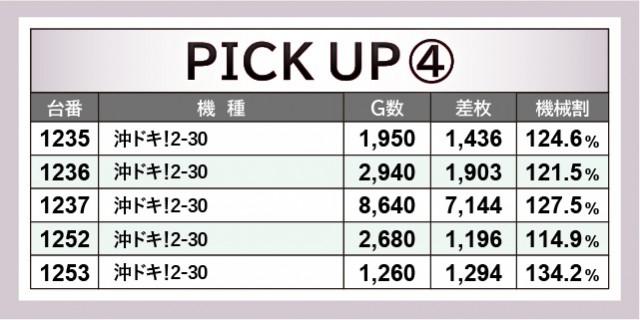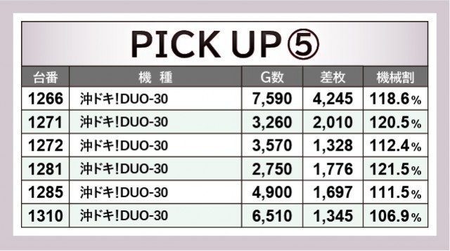 『チバリヨ-30』1228番台+13,114枚や『沖ドキ!2-30』1237番台+7,144枚など、凄まじい熱気を放っていたのが印象に残る。特に万枚OVERという記録は、同機種のポテンシャルの高さだけでなく、同店が用意したおもてなしを感じずにはいられない。『沖ドキ!DUO-30』もまた4千枚OVERと活躍し、当日のパチスロコーナーは、沖スロ機種が盛り上がりの中心だったと言っても過言ではない。