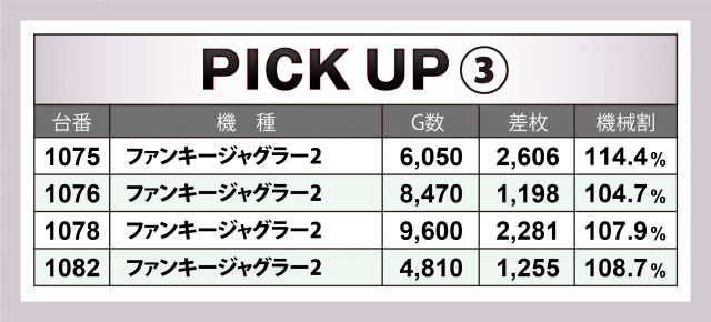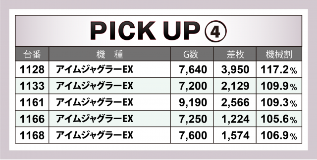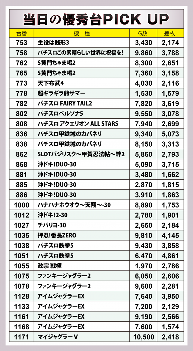 まずは優秀30台のPICK UPから。うち23台が差枚数+2千枚以上を達成、+3千枚以上は11台、+4千枚オーバーは3台となった。後述する好調マシン4機種以外では、2台の合計で+6千枚に迫った『S黄門ちゃま喝2』、+5千枚弱の台を筆頭に2台トータルで+8千6百枚となった『パチスロ鉄拳5』と6.5号機が複数ハイスコアを残した。その他、『パチスロ FAIRY TAIL2』『パチスロペルソナ5』『パチスロ アクエリオン ALL STARS』ら比較的新しい機種も好成績に。