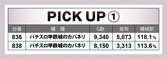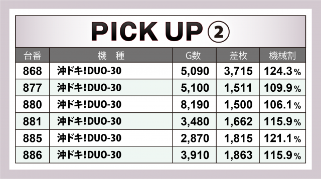 続いては好調4機種17台をチェック。ここでも優れた差枚数だったのが6.5号機の『パチスロ甲鉄城のカバネリ』で、+5千枚超の台を筆頭に2台トータルで+8千3百枚超をマーク。また6台合計で+1万2千枚を突破した『沖ドキ!DUO-30』、5台トータルで+1万1千枚オーバーとなった『アイムジャグラーEX』、4台で+7千枚を突破した『ファンキージャグラー2』3機種もナイスな結果に。